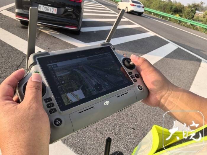 r高速交警通过无人机遥控器屏幕查看实时路况。